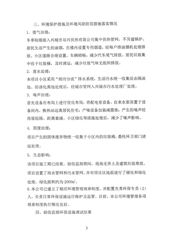 該項目根據(jù)《中華人民共和國環(huán)境保護法》和《建設項目環(huán)境保護管理辦法》的規(guī)定進行了環(huán)境影響評價。 2014年3月葫蘆島市環(huán)境保護科學研究所編制完成《葫蘆島市三和開發(fā)建設有限公司三和榮郡居住小區(qū)項目環(huán)境影響報告表》,2014年4月11日興城市環(huán)境保護局以興環(huán)審【2014】11號文給與《關于葫蘆島市三和開發(fā)建設有限公司三和榮郡居住小區(qū)項目環(huán)境影響報告表的批復》,該項目環(huán)境保護檔案資料齊全。