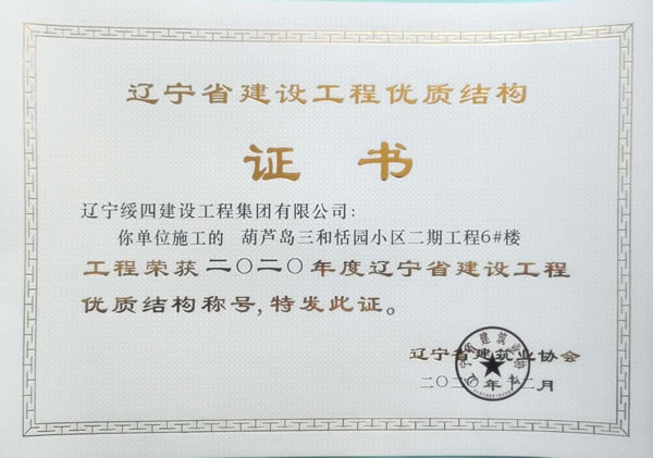 “葫蘆島三和恬園小區(qū)二期工程6#樓”榮獲2020年度遼寧省建設(shè)工程優(yōu)質(zhì)結(jié)構(gòu)稱號