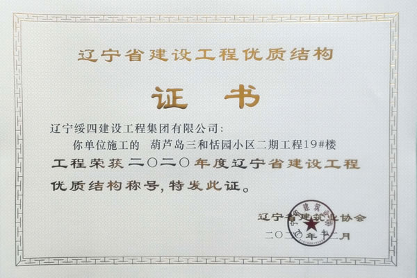 “葫蘆島三和恬園小區(qū)二期工程19#樓”榮獲2020年度遼寧省建設(shè)工程優(yōu)質(zhì)結(jié)構(gòu)稱號(hào)
