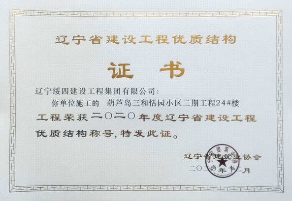 “葫蘆島三和恬園小區(qū)二期工程24#樓”榮獲2020年度遼寧省建設(shè)工程優(yōu)質(zhì)結(jié)構(gòu)稱號(hào)