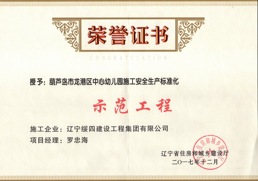 龍港區(qū)幼兒園施工安全生產(chǎn)標(biāo)準(zhǔn)化榮譽(yù)證書