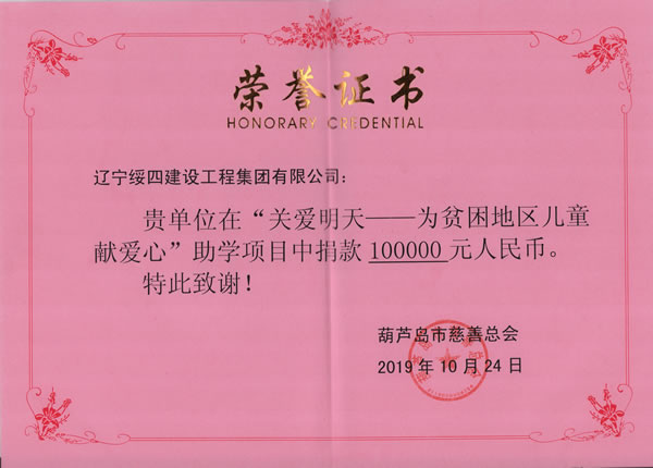 2019年10月24日,我集團(tuán)積極參與葫蘆島市教育局、葫蘆島市民政局、葫蘆島市慈善總會(huì)“關(guān)于開(kāi)展‘關(guān)愛(ài)明天——為貧困地區(qū)兒童獻(xiàn)愛(ài)心’公益活動(dòng)的倡議”活動(dòng),捐款人民幣拾萬(wàn)元整。