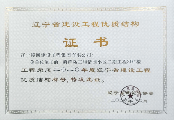 “葫蘆島三和恬園小區(qū)二期工程30#樓”榮獲2020年度遼寧省建設(shè)工程優(yōu)質(zhì)結(jié)構(gòu)稱號