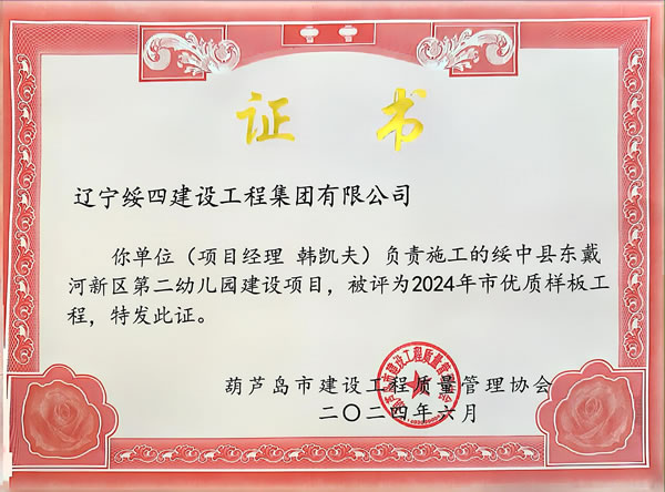 綏中縣東戴河新區(qū)第二幼兒園建設項目被評為2024年市優(yōu)質(zhì)樣板工程